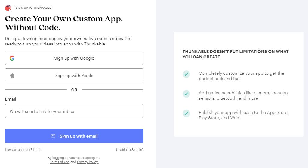 Thunkable 웹사이트에 접속하여 간단하게 가입(sign up)을 합니다.