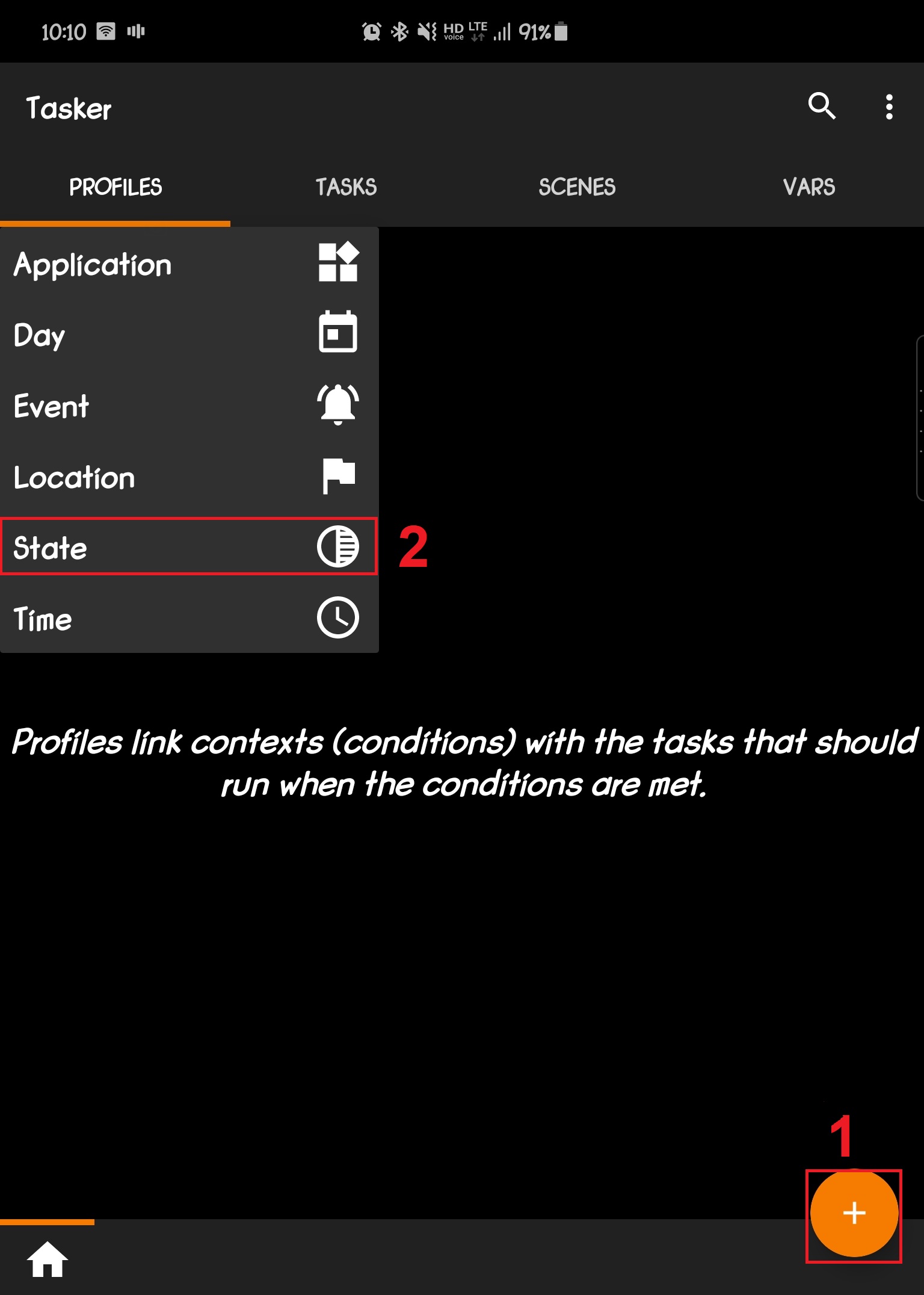 1) 1번, tasker 를 실행하고 새로운 프로파일을 만들기 위해 + 아이콘 (빨간 네모박스로 표시) 를 클릭합니다.