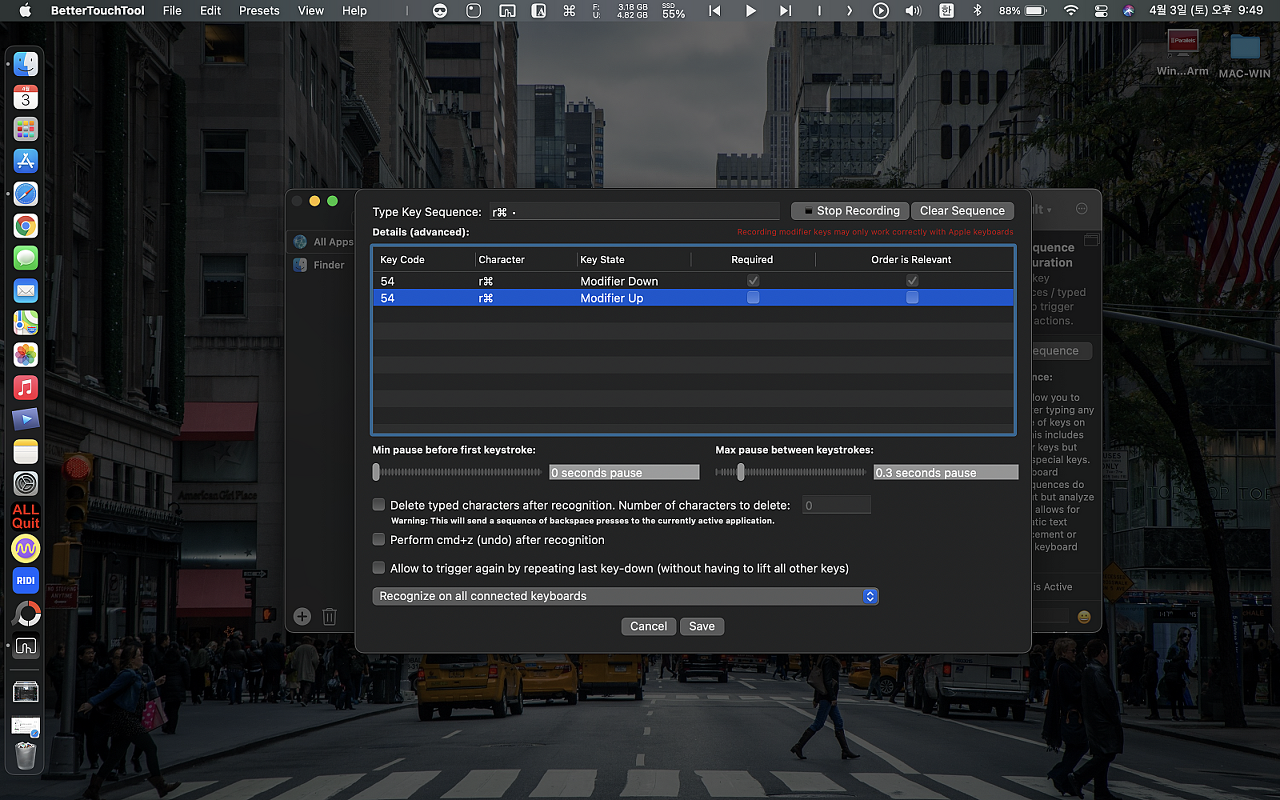 4. 키입력을 기다리는 화면입니다. 여기서 오른쪽 커맨드키를 누릅니다. 키값이 자동으로 추가됩니다.
