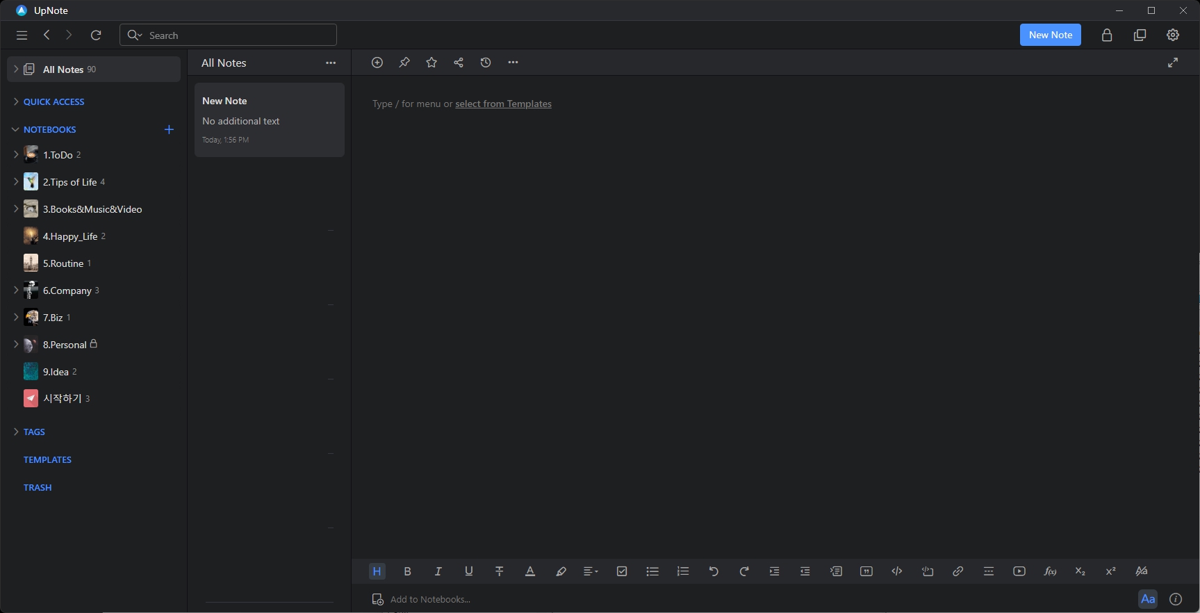 이전 글에서도 언급했지만 업노트의 스페이스 공간이란 개념이 있습니다. 이건 개별 권의 느낌으로 여러 개의 낱권으로 노트를 정리한다 생각하시면 됩니다. 개인 스페이스, 회사 스페이스, 가족 스페이스 처럼 구분해서 쓸 수 있고, 전환도 가능하죠. 이제 설명을 위해 'Upnote'라는 새로운 스페이스 공간을 만들어서 진행하겠습니다. 1. 좌측 상단의 점3개를 클릭하면 기존의 스페이스 공간이 보이며, 전환이 가능합니다. 또한 새로운 스페이스(New Space)를 만들 수 있습니다. 2. 일단 테스트용으로 새로운 스페이스를 만들고 시작하겠습니다. 이름은 원하시는 이름으로 하시면 되는데 저는 설명을 위해 'Upnote'로 하였습니다. 3. 자 이제 아래와 같이 깔끔한 너무나 심플한 화면이 나올 것 입니다. 4. 기..